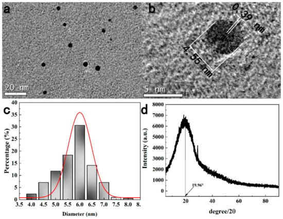 The formation of N-CDs was confirmed by TEM as shown in Figure 2a. The N-CDs were nearly quasi-spherical in shape and mono-dispersion. The HRTEM image in Figure 2b shows that the lattice spacing of ca. 0.39 nm corresponded to that of a graphitic amorphous structure. The particle size distribution histogram in Figure 2c demonstrates that their diameters were very small and mainly distributed in the range from 4.5–7 nm and the average diameter was 5.8 nm. The XRD pattern of the N-CDs in Figure 2d displayed a broad reflection peak at 2θ = 19.96°, and determined that the interlayer spacing d was 0.44 nm, which became larger than graphite (0.34 nm). The increase of the d value showed an increase of the amorphous nature which can attributed to more defect sites being introduced to the product through increased N-doping to the crystal lattice [30,31].