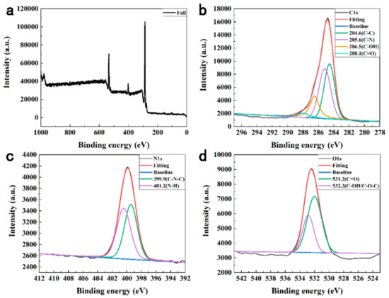 The surface functional groups and element analysis of N-CDs were confirmed by XPS. As shown in Figure 3a, N-CDs displayed three predominant strong peaks at 284.7, 399.9, and 532.4 eV, which were ascribed to C1s, N1s and O1s peak, respectively [32,33,34]. The ratio of C:N:O was 80.75: 5.45:13.80. The high-resolution C1s spectrum was shown in Figure 3b, according to the previous studies, the spectrum could be deconvoluted into four peaks at around 284.6, 285.7, 286.8, and 288.1 eV, which were attributed to C–C, C–N, C–OH, C=O groups [35,36], severally. In the high-resolution N1s spectrum shown in Figure 3c, the two peaks at 399.4 and 400.5 eV could be assigned to C–N–C and N–H groups [37,38,39], respectively. From the O1s spectrum shown in Figure 3d, the two fitted peaks at 532.0 and 532.8 eV were ascribed to C=O and C–OH/C–O–C groups [40,41], severally.