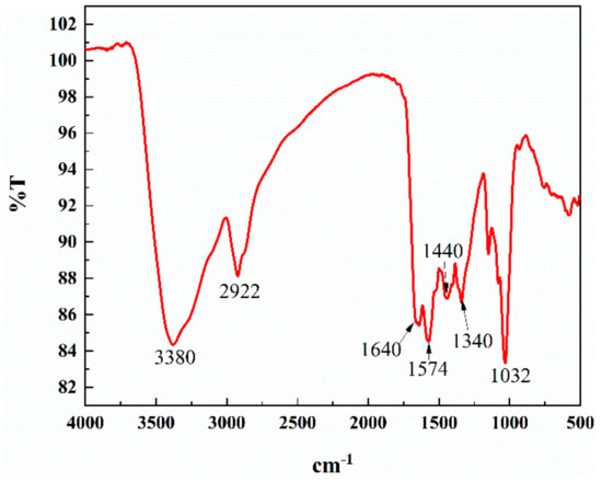 The FTIR spectrum also was used to verify the functional groups of the synthetic N-CDs in Figure 4. The characteristic absorption band at 3380 cm−1 was corresponding to the stretching vibrations of O–H and N–H bonds. The peak at 2922 cm−1 was ascribed to the C–H bonds. The absorption bands at 1640 and 1440 cm−1 were due to the COO− stretching vibrations. The characteristic absorption band of C–N at 1574 cm−1 was also observed. The band centered at 1340 cm−1 was assigned to the vibrations of the C–H bond. Furthermore, the peak at 1032 cm−1 can be attributed to the C–O band [2,42,43].
