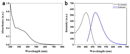 To explore the optical properties of the N-CDs, UV-vis absorption and FL spectra were studied at room temperature. In Figure 5a, N-CDs showed a inapparent absorption peak at about 280 nm [44], which was ascribed to the n-π* transition of C=O bond [4]. Figure 5b displayed the excitation and emission traits of the N-CDs, under excitation at 400 nm the strongest emission peak centered at 480 nm appeared, indicating the N-CDs with fluorescence. The quantum yield (QY) of the N-CDs was about 14.4% compared with quinine sulphate [34], and the higher QY was possible owing to nitrogen-containing functional groups which could validly passivate the surface active sites of the carbon dots. Thus the FL properties of the N-CDs were increased [41], and because of that the QY of our N-CDs was higher than most of N-CDs from biomass [11,20,21,22].