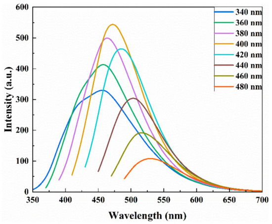 To further investigate the optical properties, the FL emission spectra of the N-CDs were recorded at various excitation wavelengths. As shown in Figure 6, the FL spectra presented a representative excitation wavelength-dependent characteristic. With the increase of the excitation wavelength from 340 to 400 nm by an increment of 20 nm, the FL intensities gradually enhanced. The strongest emission peak appeared at the excitation wavelength of 400 nm. When the excitation wavelength changed from 400 nm to 480 nm, the FL emission peaks red-shifted along with the FL intensities and decreased [45]. These behaviors were perhaps due to the different sizes of N-CDs (Figure 2c) and different surface emission sites which came from abundant organic groups (–OH, –COOH and –NH2) on the N-CDs’ surfaces [46].