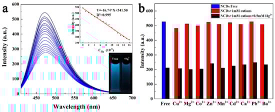 The selectivity of the N-CDs for different metal ions was also investigated in this work. We chose nine kinds of other biological and environmental relevant metal ions including Cu2+, Mg2+, Co2+, Zn2+, Mn2+, Cd2+, Ca2+, Pb2+, Ba2+. When these ions were respectively added in the solution of N-CDs, no obvious FL intensity change occurred, as shown in Figure 7b. But, after injecting Hg2+ into N-CDs solution containing other metal ions, Hg2+ could validly quench the FL of N-CDs solution. This result proved the highly selectivity of N-CDs for Hg2+ over other competitive metal ions.