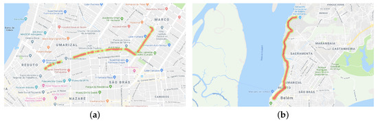 In Figure 3, we can see six trips made by participants. Figure 3a–c are trips performed by drivers and Figure 3d–f are trips performed by passengers. Because it was a naturalistic study, the participants could choose the route of the trip. In the chosen route, with the car in movement, whenever possible, the participant read a message to collect sensor data. As we can see in Figure 3, the data were collected on different routes with different directions. This feature is important to not to skew the collection of some sensors.