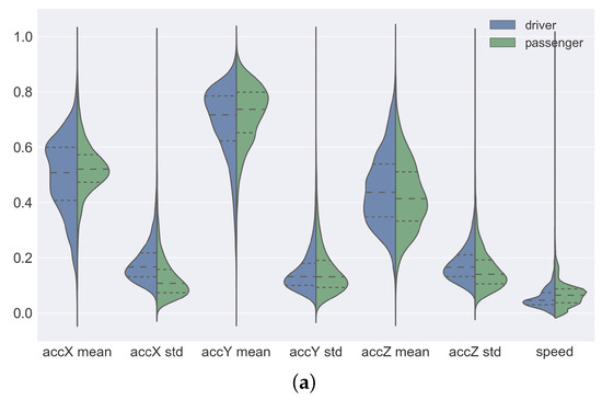 Figure 5 shows a violin plot of the distribution of the data of each attribute. In each plot, the left-hand side represents the distribution of the sensor data collected by the drivers and the right-hand side the distribution of sensor data collected by the passengers. To simplify the visualization, we apply MinMax normalization to all attributes. In this way, all the attributes were rescaled to the range of values between 0 and 1. A violin plot is a hybrid of a box plot and a kernel density plot. The plots of Figure 5a correspond to the attributes collected by the accelerometer and GPS sensors. For these attributes, we can observe that the density of the data of the drivers and passengers are almost symmetrical, in addition, the interquartile are also close. The only exception is the accX-mean attribute data. In this attribute, the driver data density is more dispersed when compared to passenger data. In Figure 5b we can see the plots of the attributes collected by the gyro sensor. In these plots, the attributes computed by the mean have very close density and interquartile. This behavior suggests that the sensor data collected by passengers and drivers are similar. For the attributes computed by the standard deviation, we can see that the driver data density is slightly more dispersed than the passenger data density. By analyzing the plots of the attributes collected by the magnetometer sensor (see Figure 5c), we can see that these are the data that have the greatest difference in density and interquartile. The attributes computed by the mean have dispersed and asymmetrical density and different interquartile between the data of the passengers and the drivers.