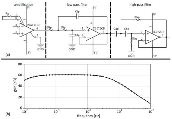 The schematic for one EGG channel is presented in Figure 1. (panel a). For amplification, an INA114 instrumentation amplifier was used in combination with an Rg resistor for gain setting–G = 1000 (specifications are given in Table 2). Both HP and LP filters were designed in Sallen–Key topology as active 2nd order filters with cut-off frequencies 0.014 Hz and 4.820 Hz, respectively. For the implementation of the filters, a TL072CP dual operational amplifier was used.