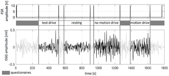The top panel shows FSR that was used as a pushbutton for manual synchronization between driving sequences and EGG segments. The bottom panel presents a sample EGG signal in one subject. Between channels there is a timeline with annotations that show the order and duration of segments. Marked segments that correspond to the questionnaires were used for the SSQ (the first one prior to the recording, and the second two after the motion and no-motion drives), and for demographic data acquisition.