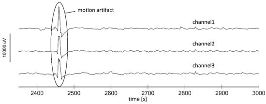 Although automatic channel selection is more desirable, it is stated in [] that the most suitable way to detect and extract movement artifacts from EGG recording is educated observation. For example, sudden moves can induce relatively large spikes on all channels simultaneously (Figure 3.) unlike the physiological variations that display time lag between channels. Having these facts in mind, an experienced researcher examined all recorded EGG time series, visually detected all movement artifacts manually, and placed the corresponding markers. Following these markers, samples originating from movement artifacts were deleted, and the corresponding time portion was excluded from the analysis.