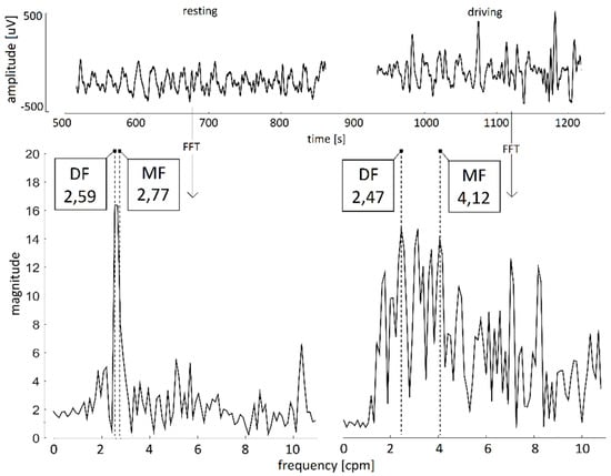 DF was calculated as the position of the maximum peak in the frequency spectrum of the EGG signal []. MF was calculated as the frequency that divides the spectrum obtained by the application of Fast Fourier Transform (FFT) into two parts with the same power integral []. Both DF and MF were determined for each segment in the EGG time series. Figure 4. presents the DF and MF parameters of two sample signals from one test subject. We can visually observe changes in the frequency content during the driving sequence compared to the resting period. This change is the consequence of frequency shifts in FFT towards the tachygastric range (4–10 cpm). DF fails to detect this obvious shift because it is dependent on the global maximum peak in FFT. On the other side, MF reliably detects these frequency alterations and can be used as a quantitative measure of a frequency shift as suggested previously in []. Although the initial results on DF and MF sensitivity (Figure 4.) suggested that DF might be excluded, both parameters were kept in order to perform a detailed analysis on all recorded segments for final decision.