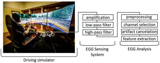 Driving simulation is a tool that provides an alternative to on-road testing in a safe, reliable, and efficient manner []. Since its first use during World War II [], it has been widely used for training and assessment of driving skills. This method, compared to traditional field testing, offers many advantages, such as safety, simplicity, cost efficiency, and variability regarding driving conditions []. However, one of its pitfalls is simulator sickness (SS), a condition including a variety of unpleasant symptoms that influences quality of experience, increases rate of drop-outs, and limits the effectiveness and duration of the training [,]. It can be described by the following physical sensations: headache, sweating, dry mouth, drowsiness, disorientation, vertigo, nausea, dizziness, vomiting, etc. [,]. Therefore, SS needs to be addressed and minimized in order to enable future advances in the field of simulator design. In order to fully understand and reduce SS problems, appropriate assessment is required. Simulator sickness is commonly assessed with self-reporting. There are a number of available questionnaires for rating the level of sickness by evaluating different physical sensations. The most commonly used methods are the simulator sickness questionnaire (SSQ) and Fast Motion Sickness Scale (FMS), which can be used for the quantification of subjective simulator sickness experience, and oculomotor discomfort, nausea and disorientation as its subcategories [,]. However, these methods do not provide information on physiological parameters, and the downside of its application is that it is not sensitive enough to discriminate between simulators []. In the review article [], it is stated that previously used physiological measurements include: (1) electroencephalography (EEG); (2) electrocardiography (ECG); (3) temperature; and (4) galvanic skin response (GSR). All these physiological measurements proved sensitivity to SS. Namely, SS occurrence was followed by: (1) increased activity in δ and decreased activity in α, β, and θ waves (EEG studies); (2) increased heart rate (ECG studies); (3) decreased skin temperature; and (4) increased skin conductance (GSR studies) []. Although all these physiological methods proved its efficacy, they are not able to identify SS occurrence and severity, and none of them provided direct assessment of the most commonly experienced SS symptom-nausea. In order to assess nausea directly, we propose non-invasive gastric motility monitoring using electrogastrography (EGG).