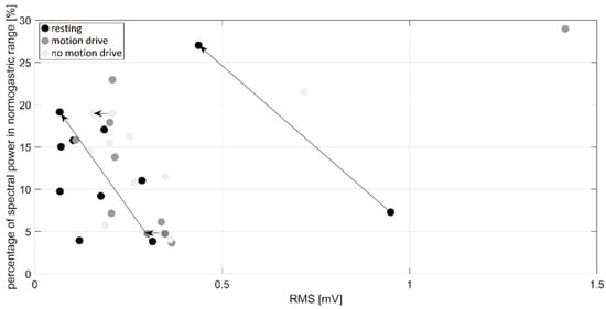 Scatter plots of RMS values and the percentage of spectral power in the normogastric range for all segments (resting, motion drive, and no-motion drive) in nine subjects are presented in Figure 6. Segments that underwent manual artifact cancelation are presented with original (noisy) and corrected (noise-free) values connected with arrows in Figure 6. Artifact cancellation was performed for four different and independent segments: (1) in ID2 and ID5 for resting; (2) in ID3 for motion drive; and (3) in ID4 no-motion drive.