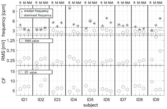 Dominant frequencies, median frequencies (upper panel), RMS (middle panel), and CF (bottom panel) values calculated for all sequences during EGG recordings and obtained in 9 subjects (ID1-ID9). Abbreviations R, M, and NM stand for resting, motion, and no motion.
