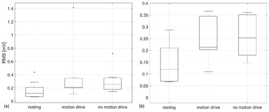 Box plots presented for RMS values divided into three groups: resting, motion, and no motion (a). A zoomed box plot is presented on (b) (from 0 to 0.4 mV).