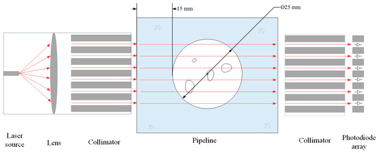 Figure 1 shows the structure of the sensing configuration, which consists of a laser source, a convex lens, two collimators, a photodiode array sensor and a data acquisition unit. The laser source is placed at the focus of the convex lens to produce parallel incident beams. The incident beams are infrared light with a wavelength of 980 nm and an output power of 100 mW. The wavelength of the laser source is selected according to the penetrability of the laser diode. When the wavelength of the infrared ray is longer than 1064 nm, most of the light is reflected by the pipe wall, resulting in the inability to penetrate the pipe. The collimators ensure that the light passes through the pipe in parallel.