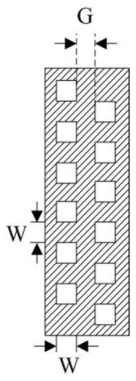 To avoid the dead space between the photodiodes, the collimators are designed with two layers, as shown in Figure 2. The two layers are parallel to each other and cross each other along the pipe axis in order to detect all the pipe cross-sections. After the parallel laser beams pass through the fluid, the intensities are reduced due to the absorption by the fluid. The collimators of the laser source and the detectors are arranged on the same axis so that the laser beams are guaranteed to be parallel and collimated. Each laser beam element has a width W of 8 mm and a uniform spacing G of 5 mm. The dead space between the photodiodes is avoided in the axial length range of 2W + G.