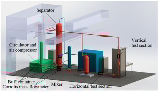 The experiments were conducted on the gas-liquid two-phase CO2 flow test rig. The structure of the test rig is shown in Figure 3. The gaseous and liquid CO2 fluids separately flow out from the upper and lower parts of the separator. The pump and air compressor separately drive the gaseous and liquid CO2 flow in the pipelines. The gaseous and liquid CO2 are fully mixed at the mixer to produce the gas-liquid two-phase CO2 flow with different void fractions. Then, the two-phase CO2 flow passes through the horizontal and vertical test sections and finally returns to the separator. Two sets of identical laser detection devices are respectively mounted on the horizontal and vertical test sections.