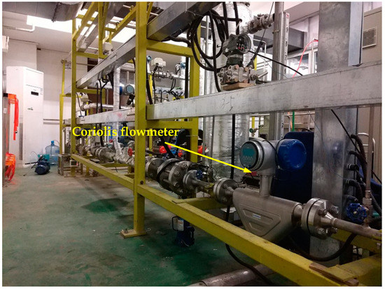 Two buffers are separately installed in the single-phase pipe sections to reduce the pulsation of the fluid and ensure that the experimental process is stable and continuous. For the purpose of reference, two Coriolis flowmeters, as shown in Figure 4, are respectively mounted downstream of the two buffers to measure the mass flowrate and the density of single gas and liquid phase CO2. Previous studies have shown that the Coriolis flowmeter can accurately measure the mass flowrate of single-phase CO2. The measurement uncertainties of the Coriolis flowmeters in the gas single-phase section and liquid single-phase section are 0.35% and 0.16%, respectively, which are accurate enough to provide the reference information. The temperature of the fluid in the pipeline ranges from 20~30 °C, and the pressure ranges from 5.7~7.2 MPa. The mass flowrate of liquid CO2 is set from 500 kg/h to 1300 kg/h, resulting in a reference gas void fraction ranging from 0% to 72%.