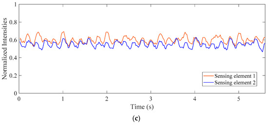 Normalized laser intensities of different patterns. (a) Stratified flow in the horizontal test section; (b) Bubble flow in the horizontal test section; (c) Bubble flow in the vertical test section.