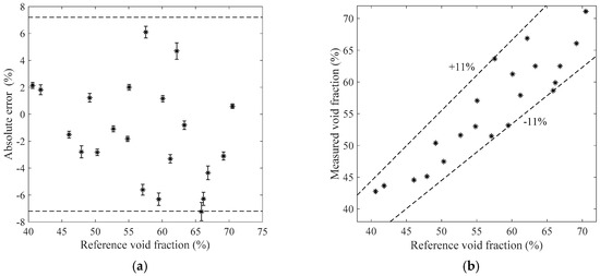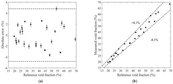 Figure 11, Figure 12, Figure 13 and Figure 14 show the measurement results of the void fraction measurement in the vertical test section with various void fraction ranges. The absolute errors of the bubble flow in the vertical test section are depicted in Figure 11a, Figure 12a, Figure 13a and Figure 14a. The relative errors are also shown in Figure 11b, Figure 12b, Figure 13b and Figure 14b. The maximum absolute error is 7.2% while the maximum relative error is ±12.2%.