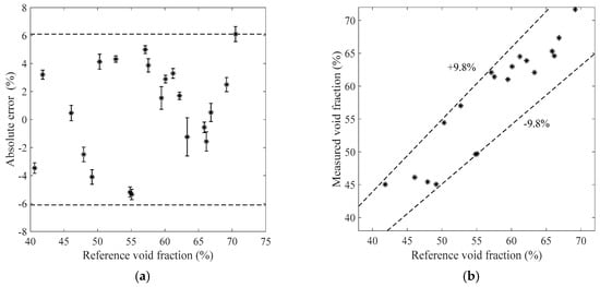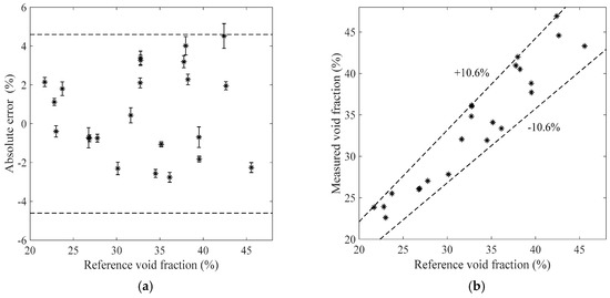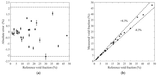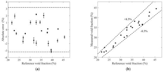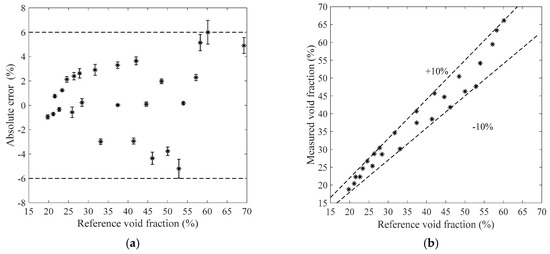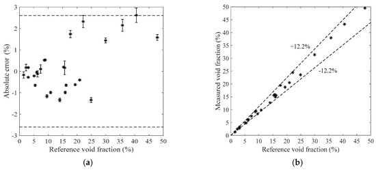 The measurement results of the bubble flow in the horizontal test section when the liquid mass flowrate is 1100 kg/h. (a) Absolute errors of the void fraction; (b) Comparison between the measured and reference void fractions.