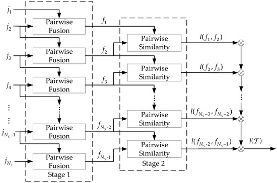 The blocks in two stages represent the calculation corresponding to pairwise fusion in Section 3.2 and pairwise similarity evaluation in Section 3.3, respectively. In the first stage, the mono tracks and from the first two sensors are gathered to construct the stereo track . Then, this stereo track is fixed, and the mono tracks from sensors 2 and 3 are selected. The process continues until tracks from sensors and are collected. The outputs of the first stage are the stereo tracks produced by each two sequential mono tracks, which can be denoted as: