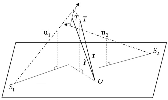 Figure 4 shows a scenario that two bearings-only sensors independently sample the same target at different instances. Specifically, at sample time , is denoted as the position of the sensor , and the distance from the sensor to the target is denoted as along a normalized LOS vector , which can be easily inferred from Equation (1) and Equation (2).