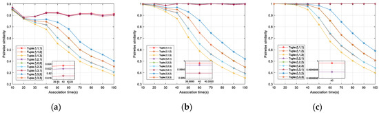 It is obvious that for a specific group of thresholds and , the pairwise similarity of the stereo tracks derived from true tuple reveals a greater dominance with the association time, i.e., the more data points the stereo tracks contains, the better performance the similarity model shows in discrimination. The similarity of true tuples calculated by Equation (19) gradually gets more significant because more constraint-qualified data points are involved. In addition, these points usually get higher scores of clues in Equation (17) due to smaller spatial biases, which can be obviously observed in Figure 7. For larger threshold parameters, the similarity of all tracks with equivalent lengths maintains a rising trend. However, the similarity of the tracks in true tuples has a disadvantage of significance reduction, e.g., the difference of the similarity decreases from 0.0016 in Figure 8a to 0.0000002 in Figure 8c when the association time is 40 s. The similarities of false tuples benefit more for two reasons. First, more points satisfy the constraints with increasing and . Second, as is analyzed in Table 2, they enhances the potential to match the false tuple with bare temporal biases and spatial biases according to the maximization in Equation (18). Thus, due to the increase in both quantity and quality of the clues, the similarity of false tuples increases.