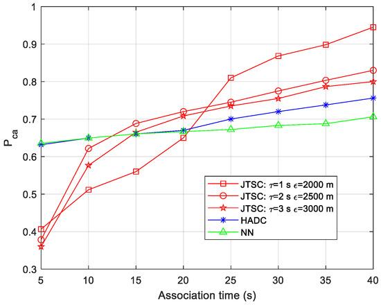 With the increasing association time, the of all three methods are always rising. When the association time is less than 10 s, JTSC performs worse than HADC and NN for approximately 0.26. However, it rises tremendously and surpasses the others when the time is longer than 20 s. Meanwhile, smaller threshold parameters lead to larger . For example, reaches the top of 0.94 for = 1 s and = 2000 m, and outperforms those for the other two groups. HADC and NN both grow smoothly from 0.62 to 0.75 and 0.70, respectively; that is to say, HADC increases faster with longer association time.
