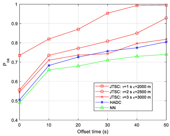 Figure 10 suggests that with the increasing offset time, all of the methods show better association performance and achieve great improvement when the offset time is 10 s. JTSC overall performs the best with different threshold parameters and grows faster than HADC and NN. Smaller group of threshold parameters always lead to a better performance. Specifically, when the offset time is 40 s, the almost reaches 1 when = 1 s and = 2000 m, which outperforms those with other parameters for 0.14 and 0.2, respectively. Meanwhile, the NN only reaches 0.73, which is worse than HADC for 0.09.