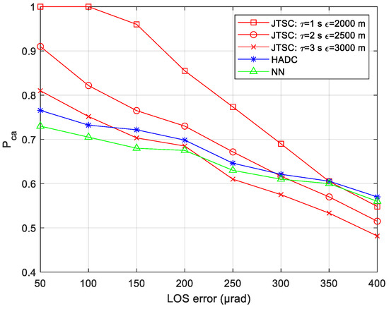 With the increasing LOS errors, all three methods show worse association performance. JTSC performs the steepest reduction, while HADC and NN are relatively smoother. JTSC with the best parameters ebbs from 1 to 0.55, and results are even worse than HADC for 0.02 when the LOS error reaches 400 μrad. HADC creeps down slightly from 0.77 to 0.57, with an overall advantage of 0.02 that is better than NN. It reaches a turning point when the of HADC and NN becomes larger than JTSC when the LOS error is over 350 μrad.