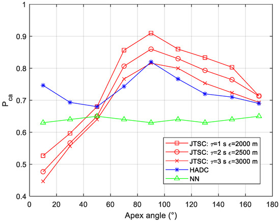 Figure 12 shows that NN has the most stable association performance at approximately 0.63, which is always worse than HADC and JTSC with an apex angle larger than 50°. The of HADC reaches two tops of 0.74 and 0.81 when the angle is 10° and 90°, respectively. JTSC is the most sensitive to the angle among the three methods. It rises dramatically when the angle grows from 10° to 90° and subsides moderately otherwise. The fierce increasing trend makes it outperform HADC and NN when the angle is larger than 70° and reaches the summit of 0.91 at 90°. However, JTSC is worse than HADC and NN for 0.23 and 0.11, respectively, with the apex angle of 10°.