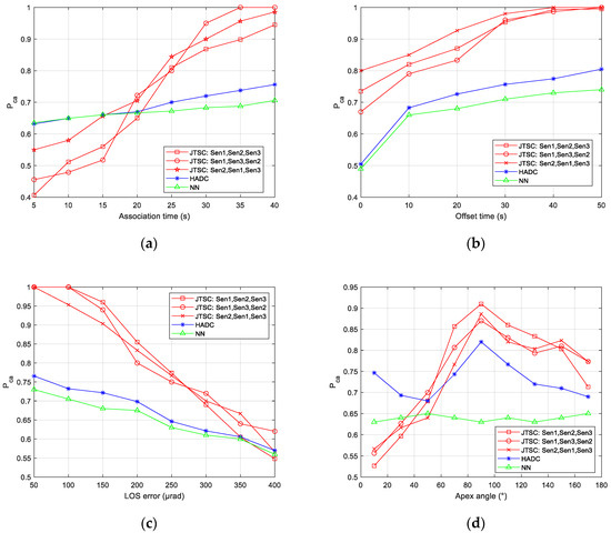 Probability of correct association vs. various conditions in different order. (a) Association time; (b) offset time; (c) LOS error; (d) apex angle.