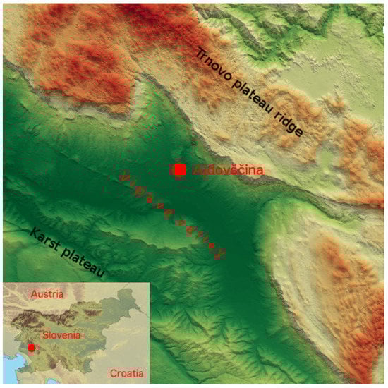 Topographic features of the Vipava Valley, located in the southwestern part of Slovenia, approximately 25 km from the Adriatic coast (inlay). On its southern side, it is confined by the Karst plateau (up to 300 m a.s.l.) and on its northern side by the steep Trnovo plateau ridge, which rises up to about 1000 m a.s.l (http://gis.arso.gov.si). LiDAR was deployed at Ajdovščina (45.87 N, 13.90 E, 125 m a.s.l.).