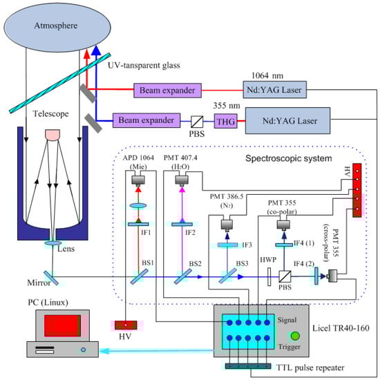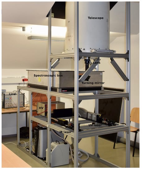 The system consisted of two independent transmitters (355 nm and 1064 nm), a receiver (telescope), a spectroscopic filter with detectors for four separate channels (vibrational nitrogen Raman signal at 386.7 nm, two Mie–Rayleigh signals at 355 nm with different polarization planes, and a Mie–Rayleigh signal at 1064 nm), and the data acquisition system, including signal amplifiers and digitizers. Although the spectroscopic filter was built to provide this option, water vapor detection capabilities using the 408.4-nm Raman channel have not yet been implemented and will be a part of a future device upgrade. A schematic view of the LiDAR system is shown in Figure 2.