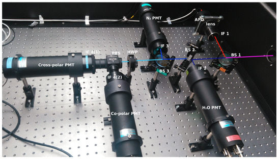 The total LiDAR return signal was separated into five channels with specific wavelengths and polarizations: the Mie–Rayleigh channel at 1064 nm, the vibrational N Raman signal at 386.7 nm, the vibrational HO Raman signal at 408.4 nm, and two Mie–Rayleigh signals at 355 nm with different polarization planes. All of the spectroscopic optical components were mounted in a light-tight box (Figure 4). Dichroic beam splitters and interference filters were order made by Barr Associates https://barr-associates.com, according to the wavelength range requirements, providing high transmission or reflection efficiency. The 1064-nm Mie signal was extracted first because the components used in this channel had the lowest optical efficiency (Table 2). A Beam Splitter (BS1) reflected the infrared light to an Interference Filter, IF1, and a 25 mm-diameter, 25-mm focal length lens, which focused it onto a 1.5-mm Avalanche Photodiode (APD) detector. At the next beam splitter (BS2), the HO signal was extracted using an interference filter, IF2. Beam-splitter BS3 was used to separate the N signal, which was further filtered by IF3. The light after BS3 was used for two polarized Mie channels, where the P and S polarizations were separated by a Polarization Beam Splitter (PBS) (CCM1-PBS25-355-HP, Thorlabs, www.thorlabs.com) and filtered by two interference filters of the same type (IF4). The specifications of all optical components used in the system are summarized in Table 2. The total optical efficiency for individual channels, including both the receiver and the spectroscopic filter, was estimated to be 18.3% for the infrared Mie channel, 42.9% for the HO channel, 41.7% for the N channel, 33.5% and 28.7% for the P and S polarization Mie–Rayleigh channels. To verify that the 2.5-mrad full convergence angle of the received light did not hinder the performance of individual channels, we estimated the shift of the central wavelength of the interference filters [29]. The shift was found to be less than 0.002 nm for the UV and less than 0.006 nm for the IR signals, which had a negligible effect on their extraction.