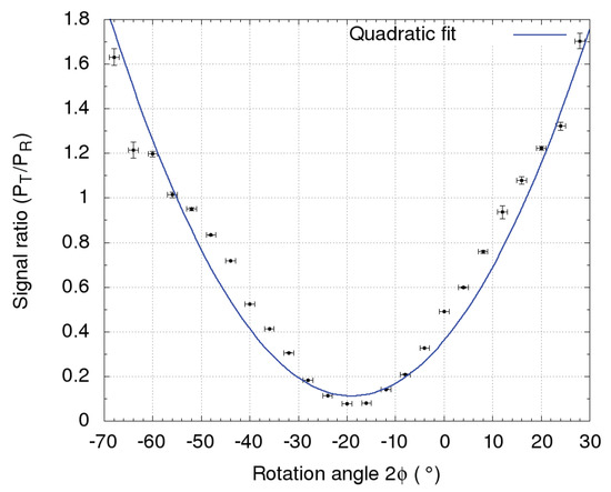 In calibration measurements of the LiDAR return, the HWP was rotated manually for an angle with respect to the horizontal polarization plane of the PBS using a mechanical rotator with angular resolution. Each of the 25 measurements, performed in consecutive 2-min intervals with a step of in the range of , caused a different rotation of the LiDAR return polarization plane of (Figure 5).