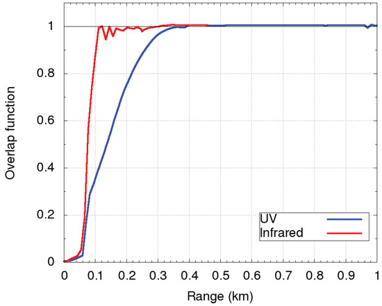 LiDAR measurements in the near range were influenced by the incomplete overlap of the field of view of the telescope and the divergence of the laser beams, emitted parallel to the optical axis of the telescope. The overlap function , needed to retrieve LiDAR data at closer ranges than the complete overlap, was experimentally obtained. For the UV laser, we used the Raman method [28], which uses both Raman and Mie–Rayleigh scattering signals to retrieve backscatter and extinction coefficients. The UV channel overlap correction function was based on 13 nighttime measurements performed between 00:00 CET and 01:00 CET on days with very clear and stable weather conditions with no wind, to assure as constant a LiDAR ratio as possible. Complete overlap was achieved at the range of about 400 m. In the calculation, the LiDAR ratio was assumed to be constant within the incomplete overlap range, which was the main cause for the variation of the overlap function between different measurements. The mean overlap function with the obtained 10% variance is shown in Figure 6 (blue).