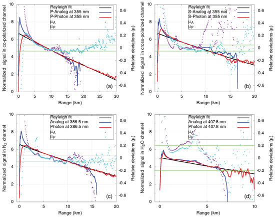 Rayleigh fit (black) to the normalized range square-corrected signals from the analog (blue) and photon counting (red) detection chains for the UV signals at 24:00 CET on 14 January 2019. Pink and light blue dots indicate deviations from the attenuated molecular backscatter coefficients calculated from the radiosonde data at Udine. Horizontal green lines indicate the individual deviations. (a) LiDAR signal in the channel at 355 nm, (b) LiDAR signal in the channel at 355 nm, (c) LiDAR signal in the N channel at 387.5 nm, (d) LiDAR signal in the HO channel at 407.8 nm.