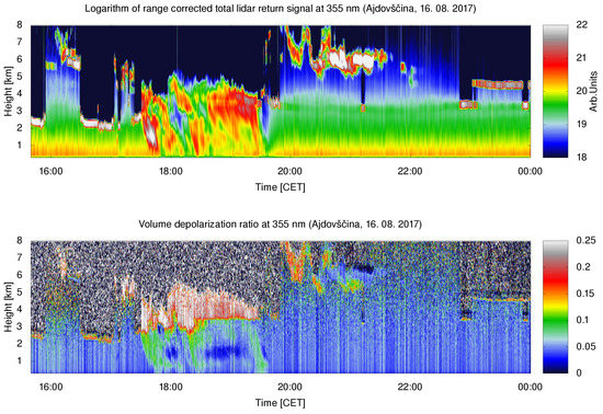 The first test case was aimed at verifying the system capability of the full-weather operation. The results were interpreted using a previous study of depolarization LiDAR returns in Mie–Rayleigh channels [39]. LiDAR data taken on 16 August 2017, before 15:30–17:30 CET, during 17:30–20:00 CET, and after the rain 20:00–24:00 CET are shown as a representative example (Figure 9). In the first period, the clouds were present in two separate layers, at 2.5 km and at 7 km. The VDR value of about 0.15 for the clouds in the lower layer, which is a bit higher than for a typical water cloud (0.1), but much lower than for a cloud composed of ice crystals (0.4), may be high due to multiple scattering. The VDR of the clouds in the upper layer was found to be above 0.25, which is a typical value suggested for a mixture of ice crystals and water droplets (the value between 0.25 and 0.4 indicates a mixture of water and ice crystals [39]). The depolarization ratio for aerosols below 2 km was found to be considerably lower than VDR within the clouds, where due to extremely high aerosol loading, it depends almost exclusively on aerosol type. The profiles of normalized attenuated backscattering coefficients at 355 nm and VDR profiles for both the presence of high (16:10 CET) and low (16:30 CET) clouds are shown in Figure 10. In the second period, volume depolarization ratios in both clouds increased to about 0.25, which may be the result of multiple scattering as well. Below the lower clouds, regions with raindrops with a volume depolarization ratio of about 0.1 can be identified. In the third period, a layer of scattered clouds was observed at heights between 5 and 7 km. The depolarization ratio below 0.1 indicated the presence of supercooled water, which may have been initially mixed with ice crystals [39]. The volume depolarization ratio of aerosols below 2 km decreased to about 0.04 as the rain washed out larger aerosols.