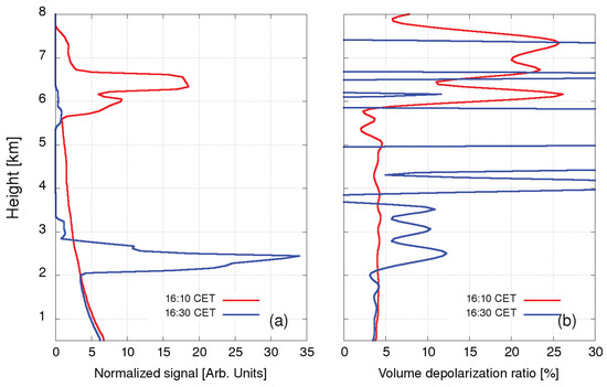 Normalized aerosol attenuated backscattering coefficients (a) and Volume Depolarization Ratio (VDR) (b) on 16 August 2017, at 16:10 CET and 16:30 CET. Peaks in the normalized attenuated backscattering coefficients determine the height of the cloud layers (6.5 km and 2.5 km). The corresponding VDR values are and .