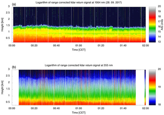 Temporal variation of the IR LiDAR return (a) and UV LiDAR (b) returns on 28 September 2017 between 00:00 and 02:00 CET shows a stable PBL with a height of about 800 m, and a residual layer with a high fraction of coarse particles up to about 1.5 km and with a low fraction of coarse particles up to about 2.5 km. The data were resampled to a 18.75-m range resolution and plotted within the complete overlap range, starting above 300 m. The heights are relative to Ajdovščina.