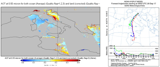 Land and ocean AOTproduct from the MODIS image of Southern Europe (including Vipava Valley) at 11:30 UTC on 28 September 2017 (left) and HYSPLIT modeled 96 h backward trajectories arriving over Vipava Valley at 00:00 CET (UTC+1) on 8 September 2017 (right). Both support the presence of aerosols from North Africa in the lower troposphere above the Vipava Valley.
