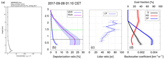 (a) The NMMB-BSC-DUSTmodel forecast of mineral dust concentration and its vertical distribution over the Vipava valley at 01:00 CET on 28 September 2017 (https://ess.bsc.es/bsc-dust-daily-forecast), (b) VDR and PDR, (c) LRat 355 nm, and (d) Dust Fraction (DF) and backscatter coefficients for Dust (D), Non-dust (ND) Aerosols. (b–d) were obtained from LiDAR measurements on 28 September 2017, 01:10–01:40 CET. Error bars stand for the estimated uncertainties. The two horizontal lines (black and green) represent the top of the PBL and the height of the elevated aerosol layer.