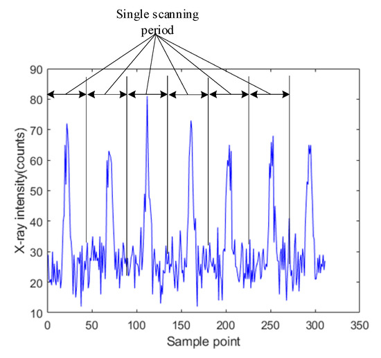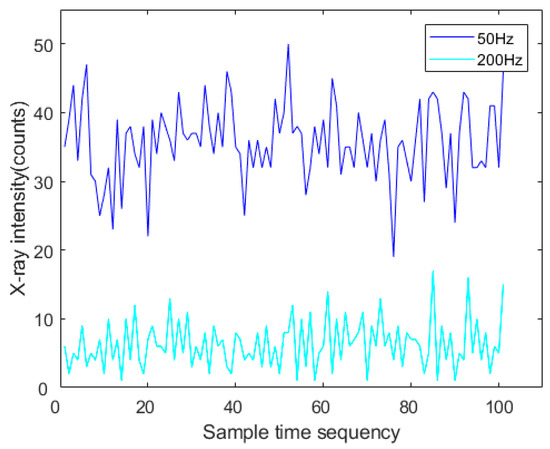 Keeping the other experimental parameters and specimen fixed, the sampling frequency was increased from 50 to 200 Hz in the experiments. The acquired X-ray intensity signal is shown in Figure 17. It can be seen that the intensity of backscattered X-rays detected by the detector decreased significantly, the burr of the detection signal increased, and the signal-to-noise ratio of the detection signal decreased significantly.
