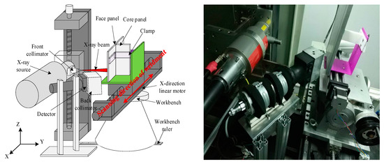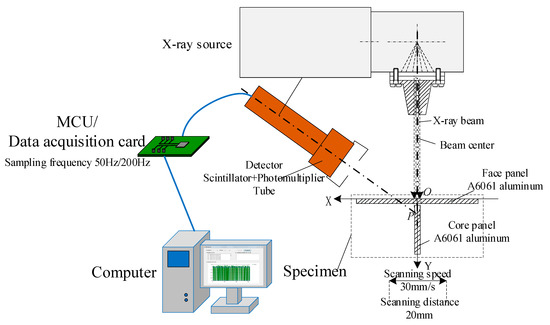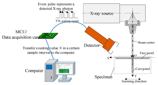 A schematic diagram of the backscattered X-ray intensity signal acquisition system is shown in Figure 5. The upper surface of the face panel was set as the X-axis, the intersection point between the center line of incident beam and the X-axis was set as origin O. The X-ray intensity signal acquisition system consisted of three parts: a signal detector, an MCU (micro control unit), and a computer. The detector consisted of a scintillator and a photomultiplier tube, which generated a pulse signal when an X-ray photon was detected, then the MCU counted the number of the pulse signals in a certain sample interval and transmitted the counted values to the computer as acquired X-ray intensity signals. Finally, the computer processed the signal and also acted as the human–machine interface of the experimental system.