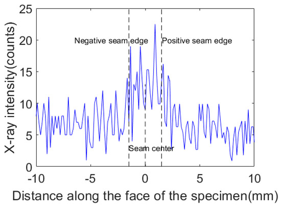 As shown in Figure 6, the acquired X-ray intensity signals contained nonstationary random disturbance, and the detected signal was not completely symmetrical with respect to the center of the weld. Furthermore, the abrupt changes in signal intensity were not detected at the seam edges because the X-ray beam was not focused very well. The diameter of the spot became larger as the collimated beam reached the upper face of the specimen. The original diameter of the spot was 2 mm when emitted from the collimator, but it became larger than the thickness of core panel when reaching the upper face of the specimen. Therefore, even at a non-weld position within a certain distance from the seam edge, the core panel was still under the illumination of the X-ray beam, and the intensity of backscattered X-ray did not decrease sharply.