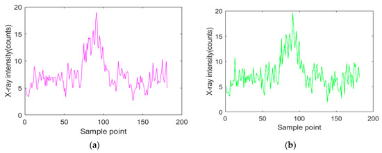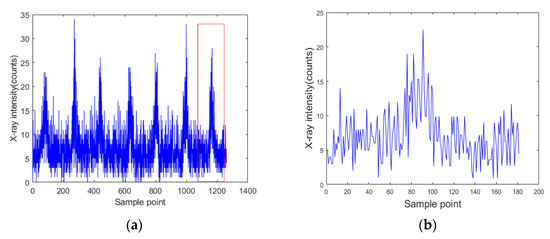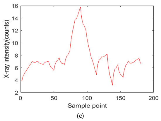 where X(k|k) and P(k|k) are utilized to obtain the updated state at sample point k + 1. The acquired signals are processed as Equations (4)–(10). This method not only suppressed the maximum value but also made the signal waveform slightly deformed, as shown in Figure 7b. The wavelet packet analysis method can provide better decomposition for a given signal, so it performs better in local analysis in time and frequency domains. In addition, wavelet packet analysis is suitable for obtaining the signal mutation. The waveform of the processed signal is also retained well [23,24,25]. Suppose the original signal is S(n), n ∈ [1,M]. The data queue S(P) with length P from S(n) is selected and then wavelet packet decomposition is run for three layers. The best threshold is sought to quantize the coefficients of wavelet packets. Finally, the denoised X-ray intensity signal S’(P) can be obtained by reconstructing with the best basis of wavelet packets. Therefore, the wavelet packet method is suitable for processing signals with nonstationary random noise and mutation signals. From Figure 7c, we can see that the non-stationary random noise originally contained in the original X-ray intensity signal was significantly eliminated by the wavelet-packet-based denoising algorithm.