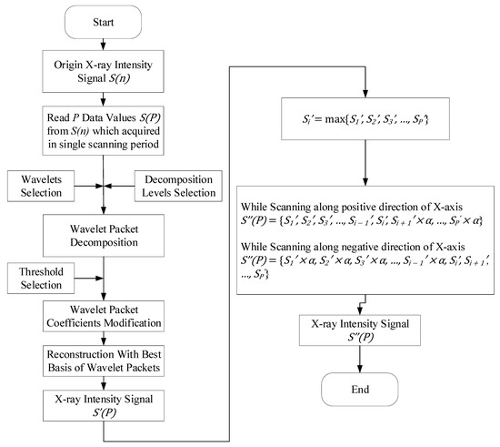 Figure 8 shows a flowchart of the processing algorithms for the X-ray intensity signals. The nonstationary random noise contained in the original X-ray intensity signals was eliminated effectively by using the wavelet-packet-based processing algorithm (see Figure 10d).