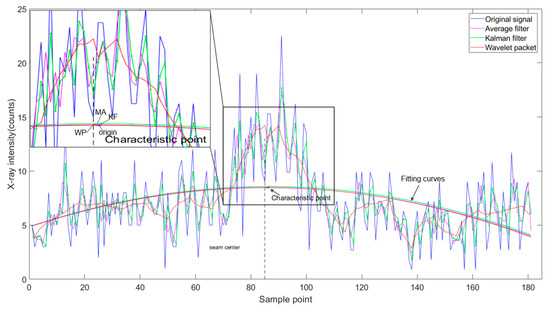 As can be seen from the above analysis, the actual measured value has a large fluctuation, which can be regarded as the interference of noise on the accurate signal. The blue curve in Figure 3 is the detected X-ray intensity signals acquired for the same non-weld location at different times. From Figure 3, it can be seen that the actual intensity values acquired for the same position were not the same even when the whole set of detection parameters remained constant. Therefore, it was necessary to process the original signal through an appropriate denoising algorithm to more accurately extract the characteristic value of the X-ray intensity signals representing the center position of the core panels.