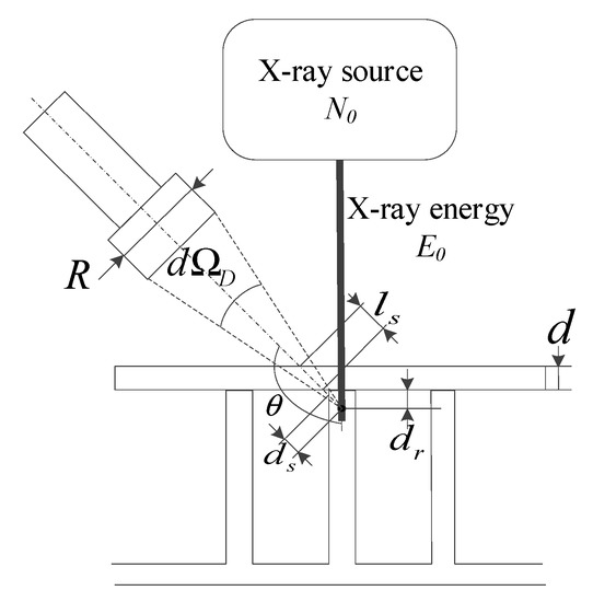 According to the above analysis, an analytical model is put forward for calculating the intensity of backscattered X-rays acquired by the detector (Equation (11)). The influences of the three attenuation sections are included in the model, and the influences of other detection parameters (e.g., detector size and detection efficiency) on the acquired X-ray intensity are also considered. As shown in Figure 11, assuming that a single-energy X-ray beam with energy E0 is irradiated on a section of the specimen, the X-ray intensity detected by the detector in unit time is: