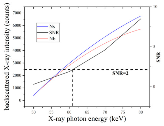 According to Equations (11)–(17), a range of detection system parameters were predetermined for a given specimen. The equations were utilized to obtain the appropriate parameters of the X-ray source in the detection system to reduce the radiation dose. To obtain the appropriate parameters of the X-ray source, the parameters of the specimen and the current detection system (listed in Table 2 and Table 3, respectively) were substituted into Equations (11)–(17). The backscattered X-ray intensities from positions with/without core panel (i.e., Ns and Nb) were calculated under different X-ray photon energies and X-ray beam intensities.